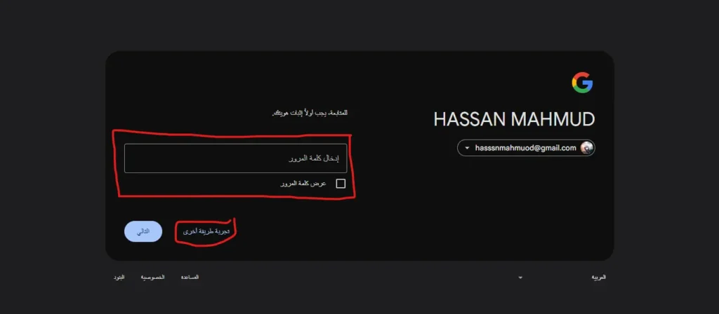 عندما تصل إلى صفحة إدخال كلمة المرور، إذا كنت لا تتذكرها، اختر خيار “تجربة طريقة اخري” سيؤدي هذا إلى بدء عملية الاسترداد وإظهار خيارات التحقق المتاحة لحسابك.